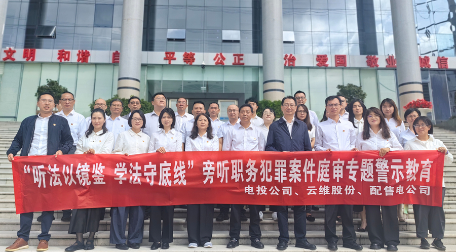为持续强化廉洁从业意识,筑牢拒腐防变思想防线,电投、云维及配售电公司党委纪委创新廉洁教育形式,抓住“关键少数、重点岗位”这条主线,于9月4日组织领导班子成员、关键岗位管理人员共30余人,到昆明市西山区人民法院开展“听法以镜鉴 学法守底线”为主题的职务犯罪案件庭审旁听,联合开展“沉浸式”“入脑入心”式警示教育活动。