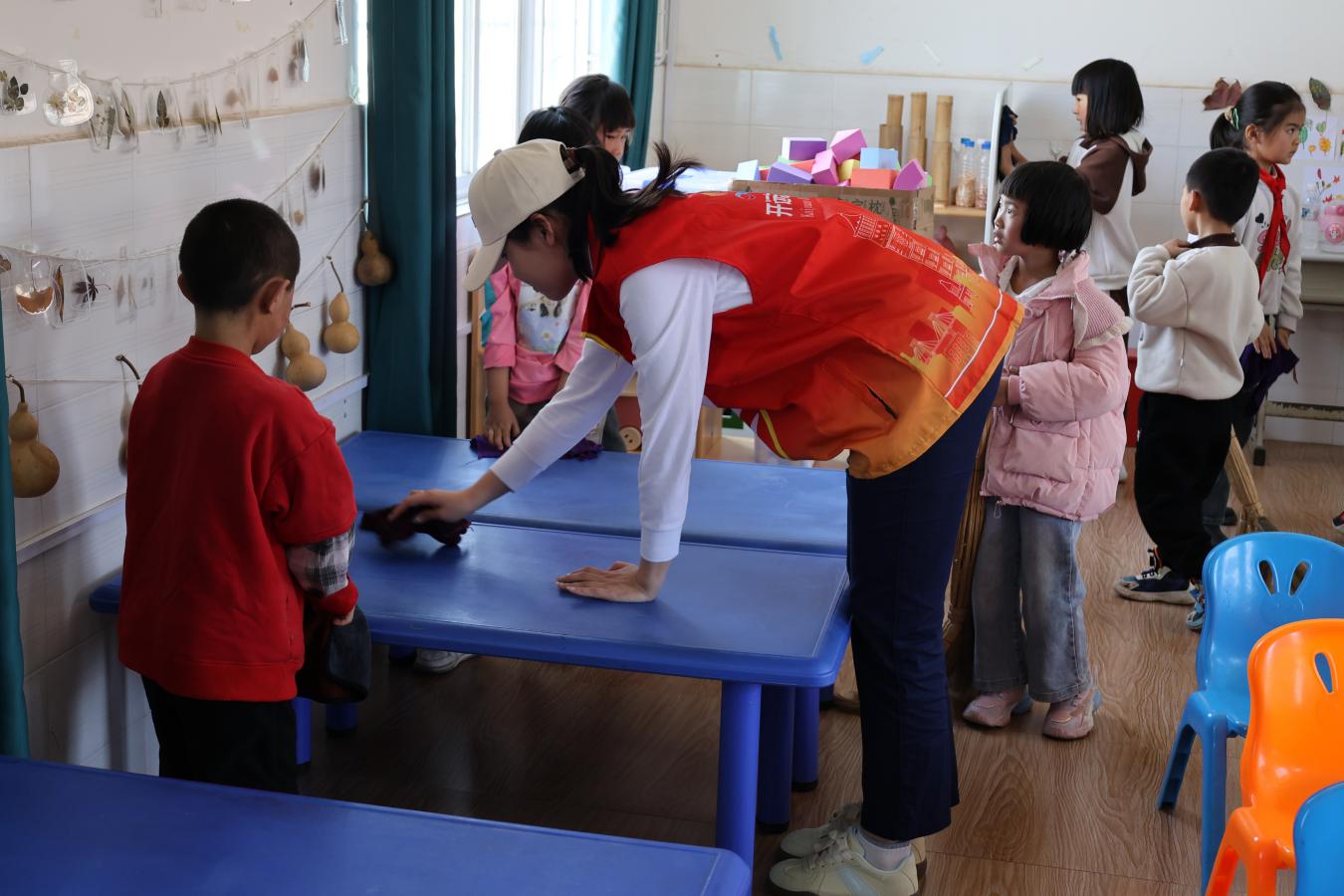 校园里,志愿者们手持扫帚、抹布,与孩子们组成“清洁小分队”,开启了一场别开生面的劳动实践。孩子们干劲十足,有的打扫教室,有的踮脚擦拭教室玻璃,志愿者们一边示范劳动技巧,一边讲述“劳动最光荣”的意义。在欢声笑语中,校园变得更加整洁,孩子们也体会到了劳动带来的快乐与成就感。