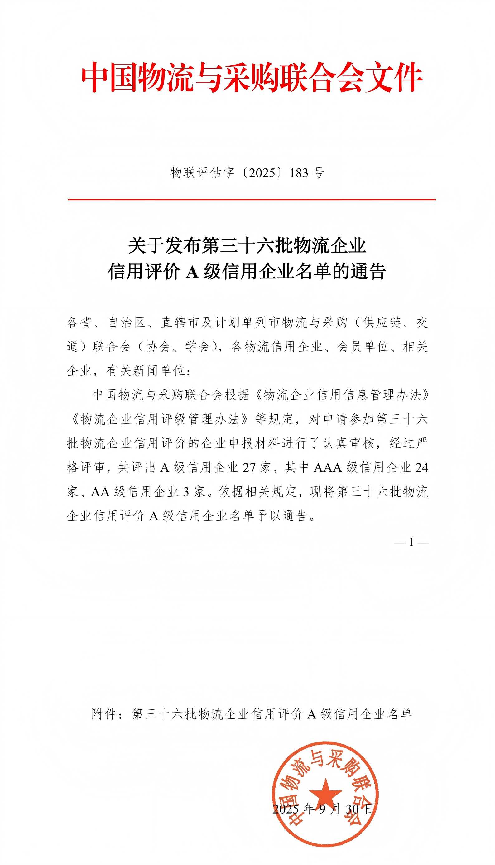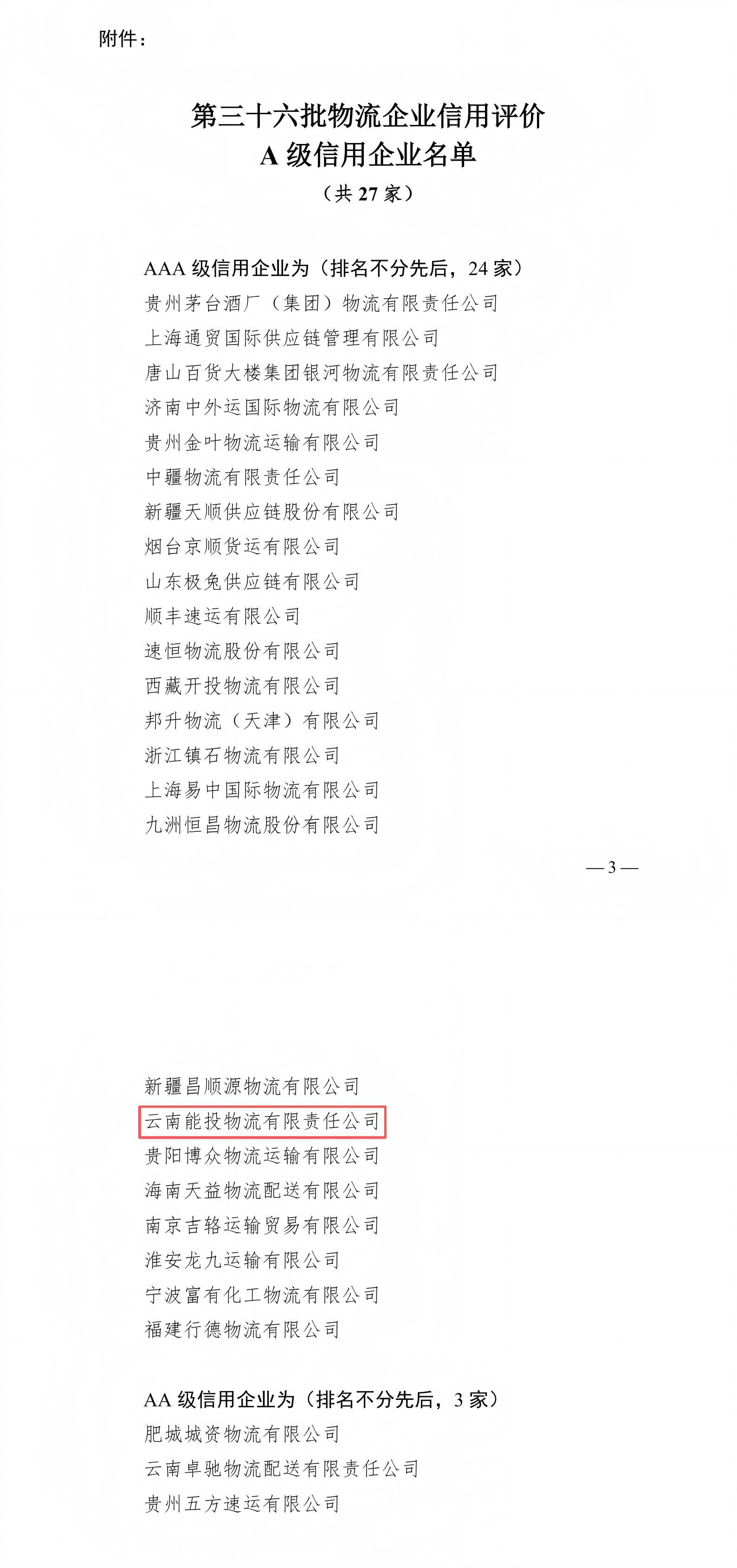 近日,中国物流与采购联合会正式发布了第三十六批物流企业信用评价结果。能投物流凭借良好的市场信誉和规范的经营行为,持续蝉联“物流企业信用评价A级信用企业名单”榜单(AAA级信用企业)。