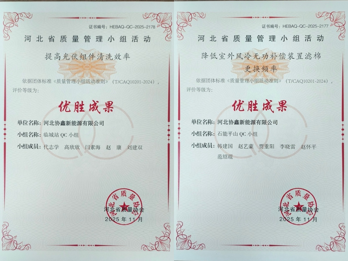 其中《降低山顶风口光伏组件及支架吹落损坏次数》荣获全省一等成果、《降低光伏电站汇流箱支路绝缘故障率》荣获全省二等成果,另有4项成果荣获优胜奖。河北公司以QC小组活动为抓手持续推动精细化管理和精益生产,运用科学质量管理方法,聚焦光伏电站现场痛点难点问题,通过深度剖析问题根源、精准施策抓实整改,消除多项现场技术难题。