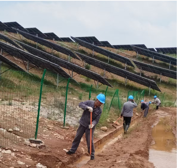 曲靖公司清理贮灰场区域的光伏板区域的排水沟,为防汛做好准备。
