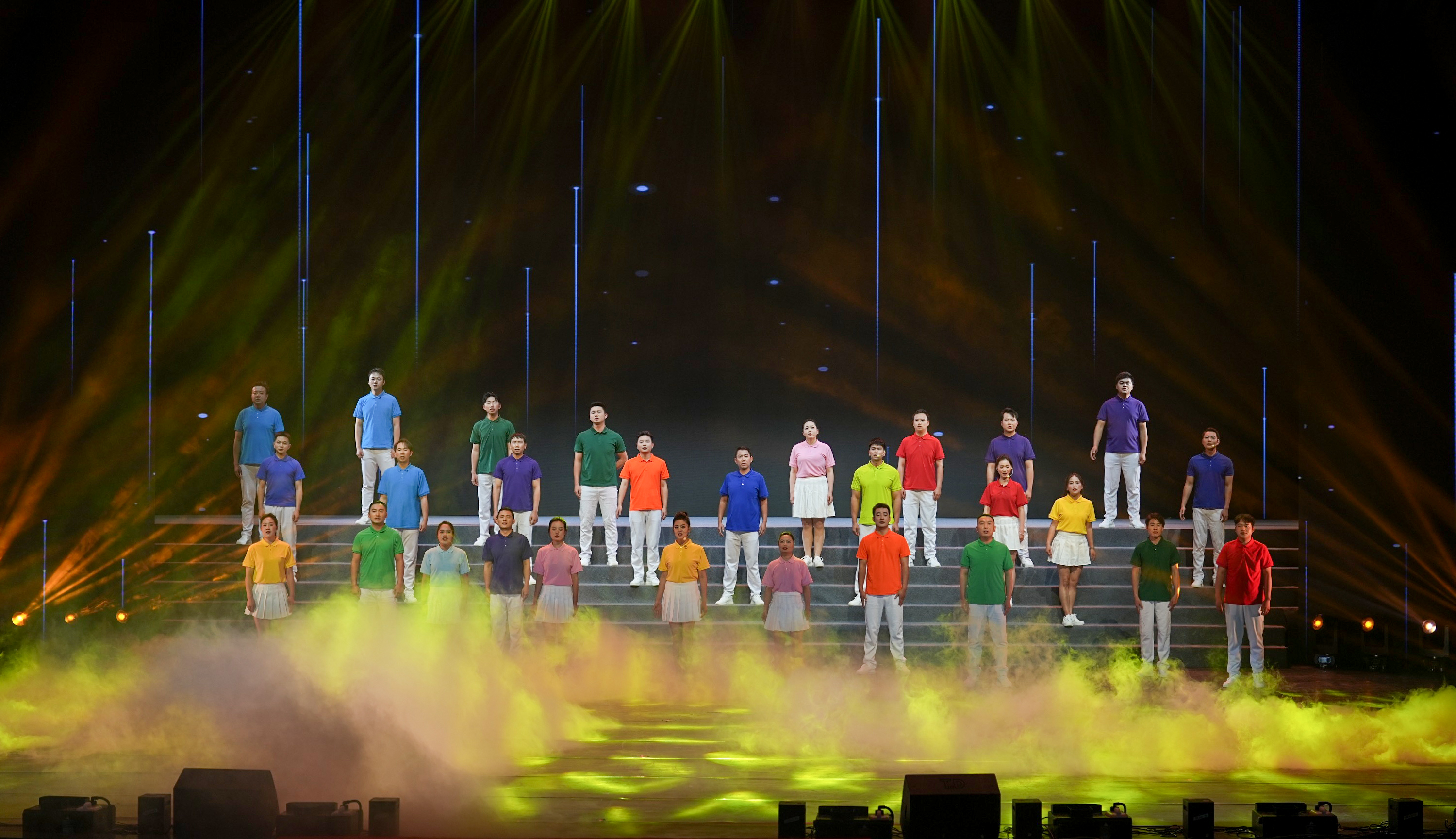 歌曲联唱《未来狂想曲》融入科技元素,通过人屏互动,展现能投员工“你中有我、我中有你”相互协同、并肩同行的精神风貌。