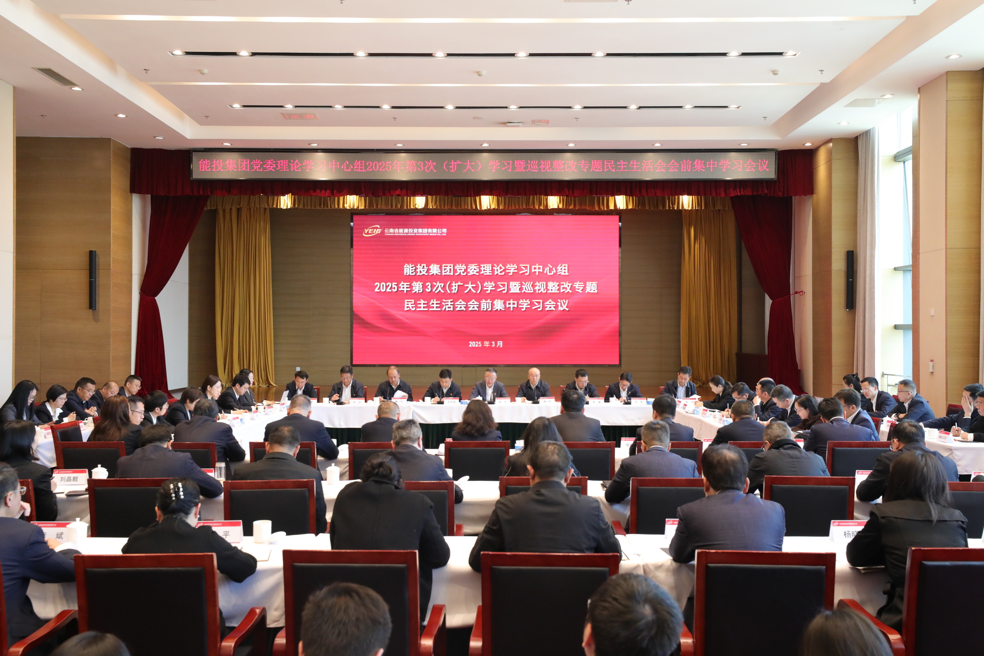 3月24日,能投集团党委召开理论学习中心组2025年第3次(扩大)学习暨巡视整改专题民主生活会会前集中学习会议,深入学习贯彻习近平总书记关于巡视整改、作风建设等重要论述,系统领悟中央八项规定精神以及相关党内法规要求,切实增强抓好巡视整改的思想自觉、政治自觉和行动自觉,为从严从实开好巡视整改专题民主生活会打牢思想基础。集团党委书记、董事长胡均主持会议并讲话。